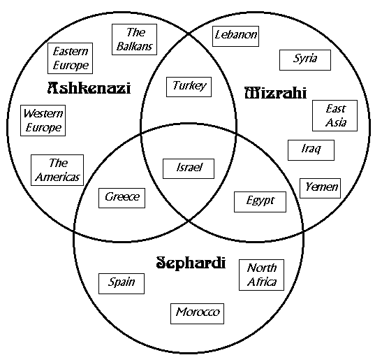 The Three Streams of Jewish MusicWe can describe Jewish Music as having three distinct streams. One is the Ashkenazi, or Western stream. This includes Klezmer, and is music originating in Eastern Europe and extending to the rest of Europe and the Americas. The second stream is the Sephardi, which refers to Mediterranean cultural sources, including Spain, Portugal, North Africa, Greece, and Turkey. The third stream is the Mizrahi, literally Eastern, and refers to the music of Jewish people who resided over the centuries amidst Arabic cultures. Of course these three streams are not completely separate, but do in fact intersect in many places (see diagram 1 below).